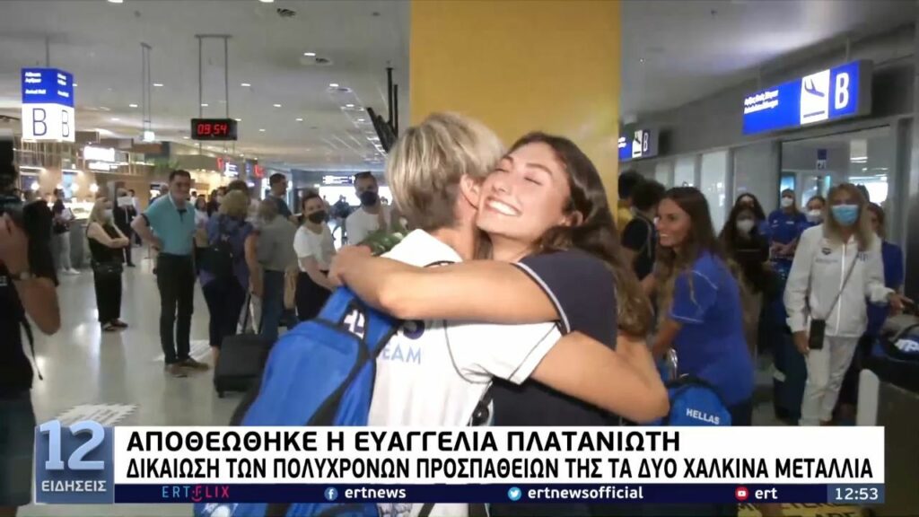Λίγο μετά τις 09:00 το πρωί της Κυριακής (26/6), η Ευαγγελία Πλατανιώτη προσγειώθηκε στο “Ελευθέριος Βενιζέλος” μαζί με όλα τα μέλη της αποστολής της Ελλάδας σε κολύμβηση και καλλιτεχνικό. Η χάλκινη παγκόσμια πρωταθλήτρια δήλωσε ικανοποιημένη από το αποτέλεσμα της προσπάθειάς της, ενώ μίλησε και για το ευρωπαϊκό πρωτάθλημα της Ρώμης.