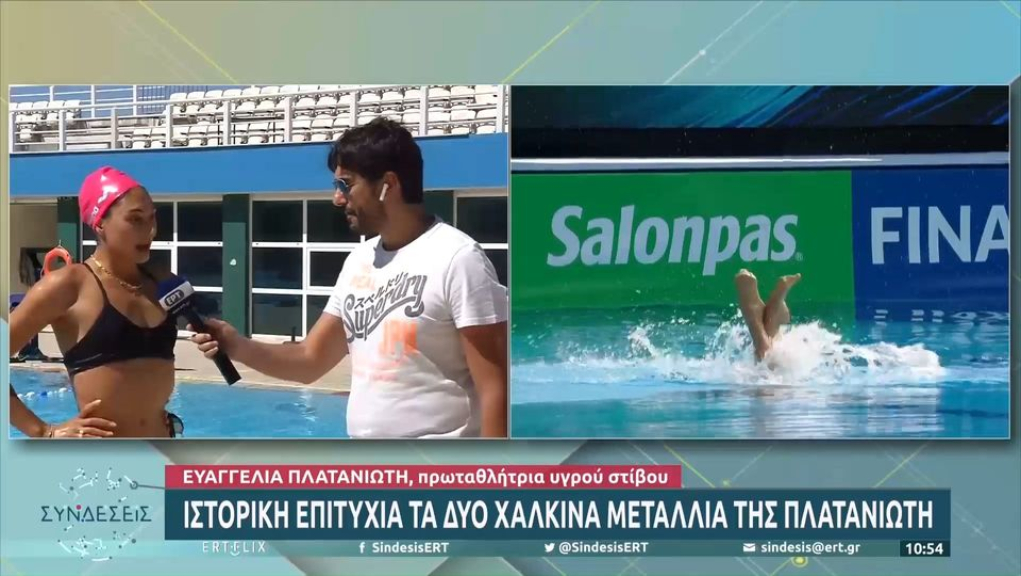Η Ευαγγελία Πλατανιώτη, μίλησε στην ΕΡΤ και την εκπομπή “Συνδέσεις” για τη μεγάλη επιτυχία με τα δύο χάλκινα μετάλλια στις πισίνες της Βουδαπέστης για το Παγκόσμιο πρωτάθλημα υγρού στίβου. Αναφέρθηκε στην ατυχία με τη μη συμμετοχή της στους Ολυμπιακούς αγώνες, ενώ μίλησε για τη σοκαριστική στιγμή, όταν η Ανίτα Αλβάρες έχασε τις αισθήσεις της μέσα στην πισίνα.