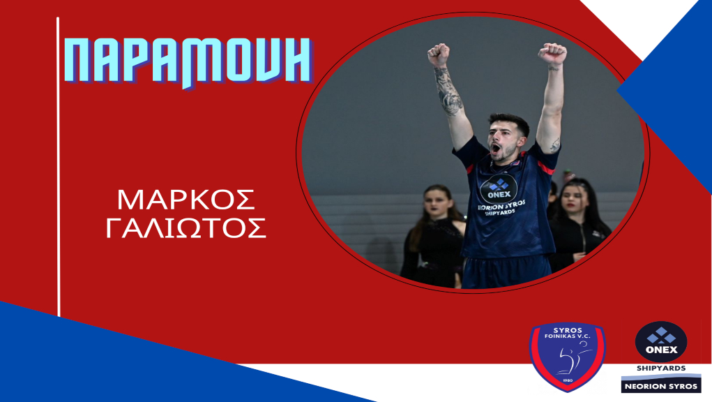 Ο Φοίνικας Σύρου ΟΝΕΧ ανακοινώνει τη συνέχιση της συνεργασίας με τον Μάρκο Γαλιώτο για τη σεζόν 2022-23. Ο διεθνής πασαδόρος είχε υπογράψει το 2021 τριετές συμβόλαιο με τον Φοίνικα, το γεγονός όμως ότι η ομάδα αναμένεται να παρουσιαστεί ιδιαιτέρως ανταγωνιστική την προσεχή σεζόν, του δίνει ακόμα μεγαλύτερο κίνητρο για καλύτερες επιδόσεις στο κυνήγι των στόχων.