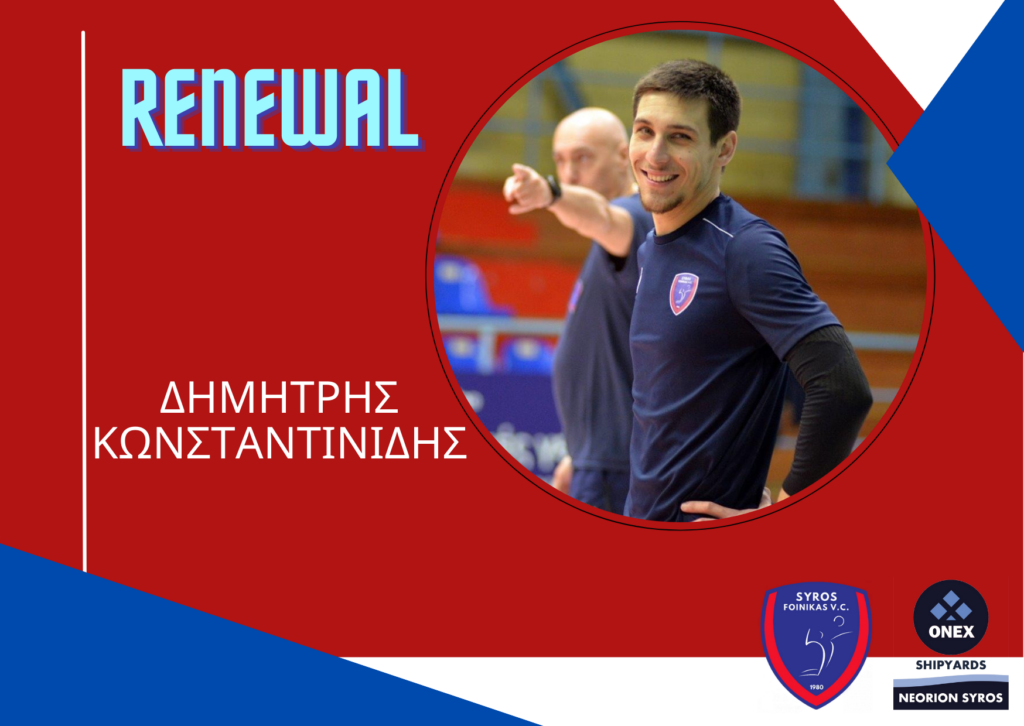 «Ο Φοίνικας Σύρου ΟΝΕΧ ανακοινώνει την ανανέωση της συνεργασίας με τον Δημήτρη Κωνσταντινίδη. Ο Εβρίτης λίμπερο θα μείνει για 2η χρονιά στη Σύρο, με την οποία έχει κατακτήσει το Super Cup το 2021».
