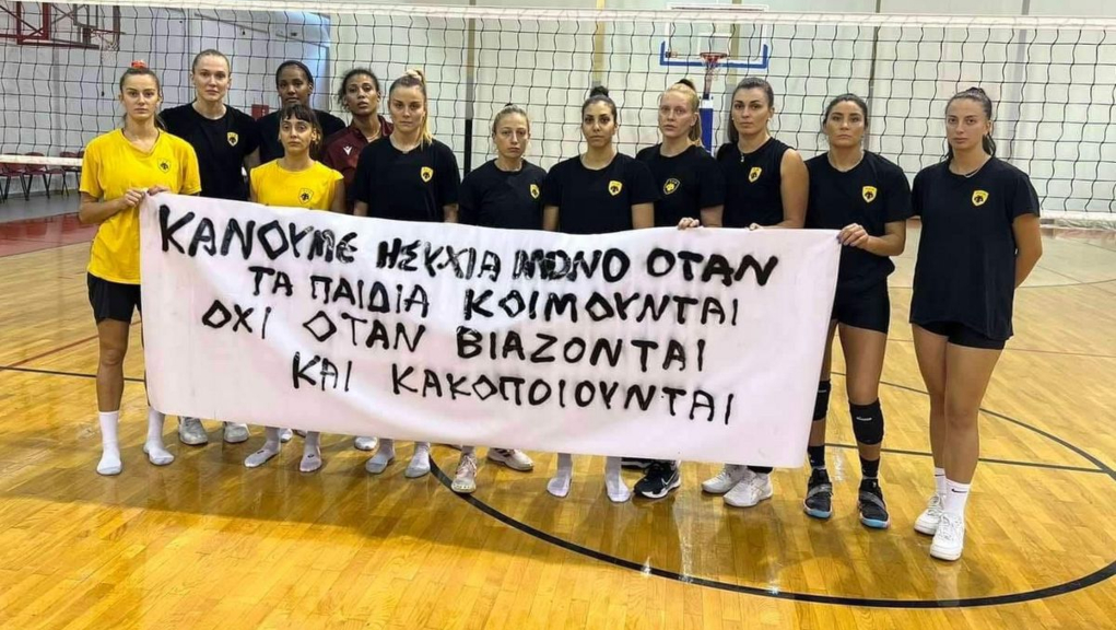 Συγκεκριμένα, το πανό που κράτησαν οι αθλήτριες της ΑΕΚ έγραφε: «Κάνουμε ησυχία μόνο όταν τα παιδιά κοιμούνται, όχι όταν βιάζονται και κακοποιούνται», στέλνοντας το δικό τους μήνυμα για την παιδική κακοποίηση.