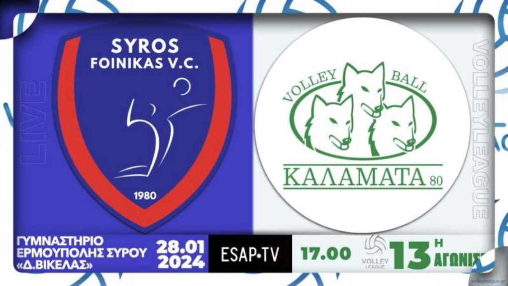 Με το ντέρμπι επιβίωσης μεταξύ του Φοίνικα Σύρου και του Α.Ο.Καλαμάτα 80 θα ολοκληρωθεί η 13η αγωνιστική στο πρωτάθλημα Volley League (γυμναστήριο Δ.Βικέλας, Σύρος, 13η αγωνιστική, 28/1, 17:00, Live Streaming ESAP T.V. You Tube, Διαιτητές: Γεροθόδωρος, Μουλά Λ.).