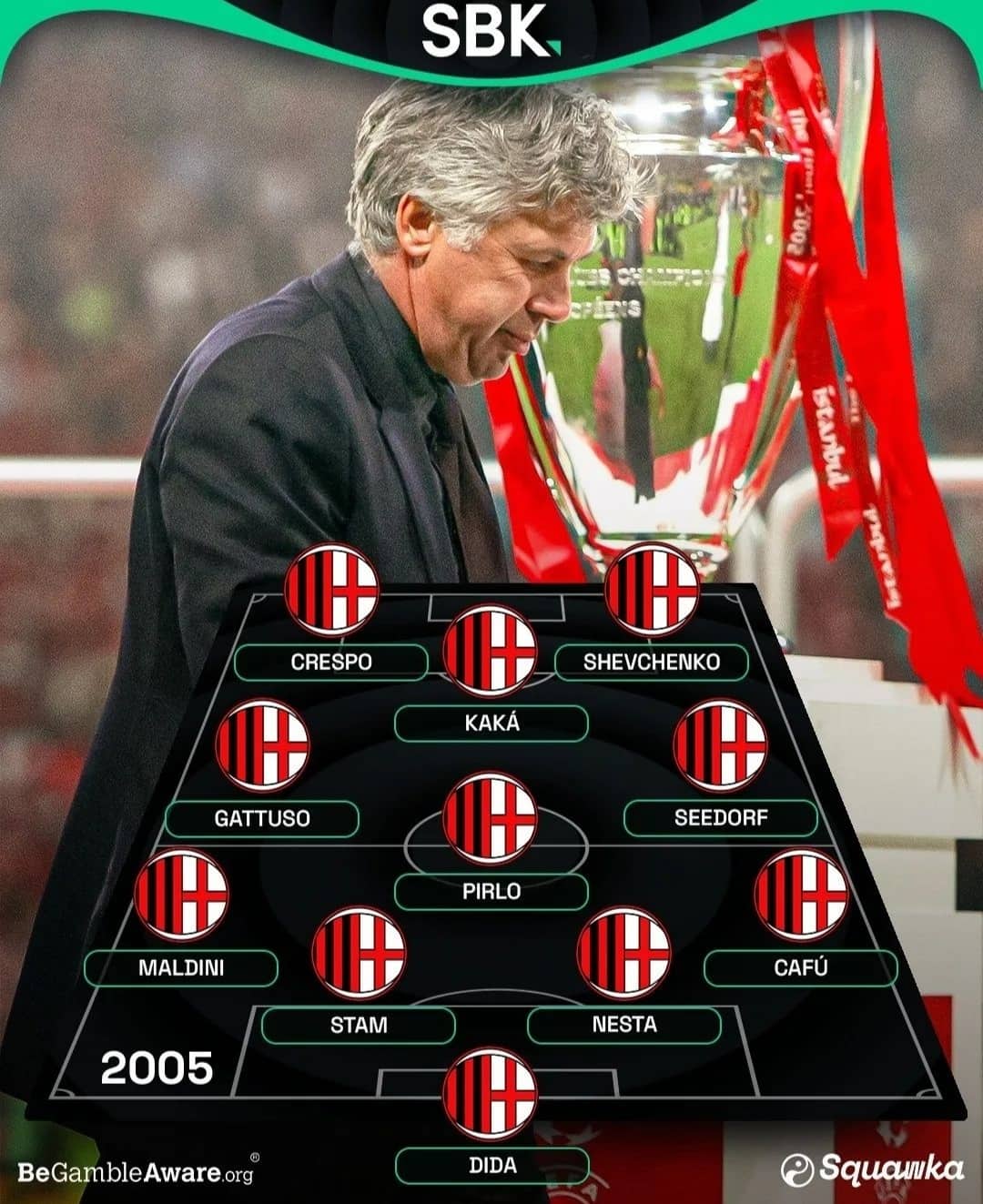 Υπό την καθοδήγηση του Κάρλο Αντσελότι, η Μίλαν έφτασε σε δύο ακόμη τελικούς, αντιμετωπίζοντας και στους δύο τη Λίβερπουλ. Το 2005 έχει μείνει στην ιστορία για την ιστορική ανατροπή των «κόκκινων», κόντρα σε μία ομάδα που ήταν υπερπλήρης σε κάθε θέση. Σε σύστημα 4-3-1-2 και πάλι, ο Ντίντα ήταν πάντα κάτω από τα δοκάρια και οι Σταμ, Νέστα συνέθεσαν ένα δίδυμο που φοβόταν κάθε επιθετικός. Ο Πάολο Μαλντίνι έβαζε, προφανώς, το δικό του λιθαράκι σε αυτό από τη θέση του αριστερού μπακ, ενώ στην αντίθετα πλευρά ήταν ο Καφού, που αποτελεί μέχρι και σήμερα έναν εκ των κορυφαίων δεξιών μπακ όλων των εποχών. Η μεσαία γραμμή απαράλλαχτη, ενώ στο μεσοεπιθετικό παιχνίδι των «ροσονέρι» προστέθηκε το… μεγαλείο της απλότητας με την παρουσία του Κακά και στην κορυφή της επίθεσης ο Ερνάν Κρέσπο είχε θέση βασικού έναντι του Φιλίπο Ιντζάγκι.