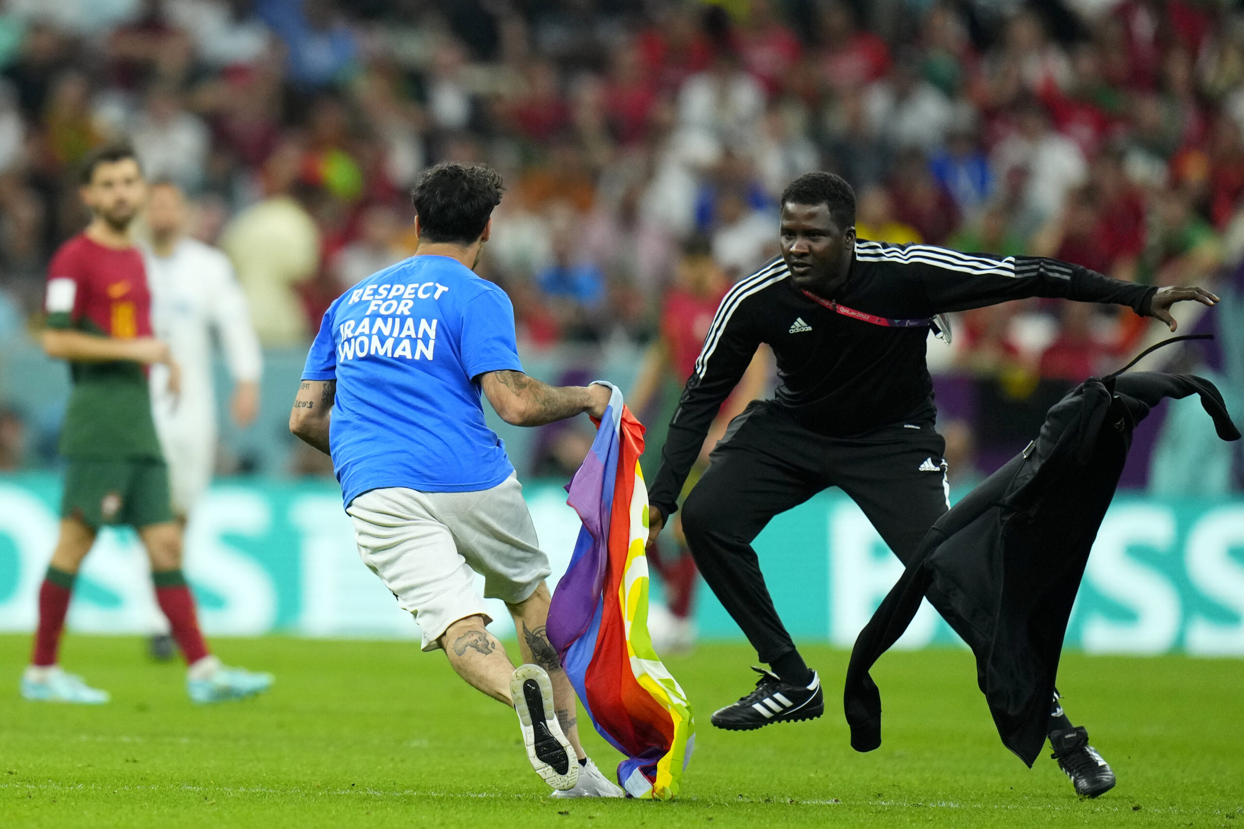 Το παιχνίδι μεταξύ Πορτογαλίας και Ουρουγουάης διακόπηκε για μερικά δευτερόλεπτα, καθώς ένας υποστηρικτής της ΛΟΑΤΚΙ+ κοινότητας εισέβαλλε στον αγωνιστικό χώρο και πέταξε μία σημαία του ουράνιου τόξου, θέλοντας να διαμαρτυρηθεί για τα δικαιώματα της εν λόγω κοινότητας, η οποία δεν γίνεται σεβαστή σε όλες τις χώρες.//