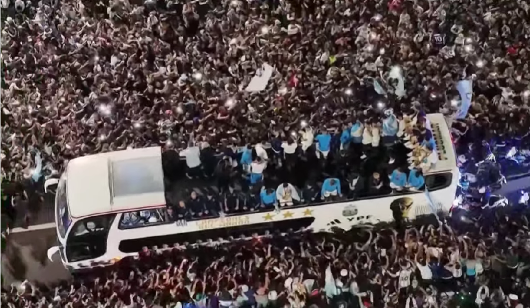 La selección salió del aeropuerto de Buenos Aires después de que fueron recibidos con vítores y ahora se dirige al centro de entrenamiento de la AFA donde pasará la noche antes de un desfile de celebración más tarde este martes. https://t.co/ufBOgWEujZ pic.twitter.com/upPACs2RLE