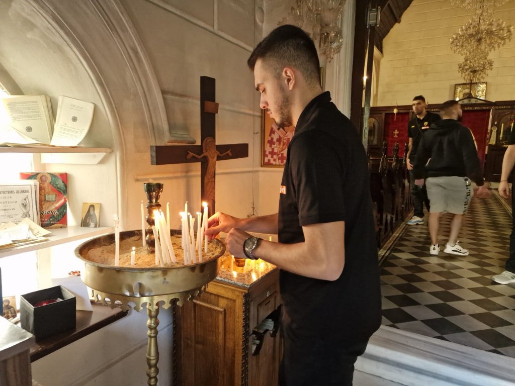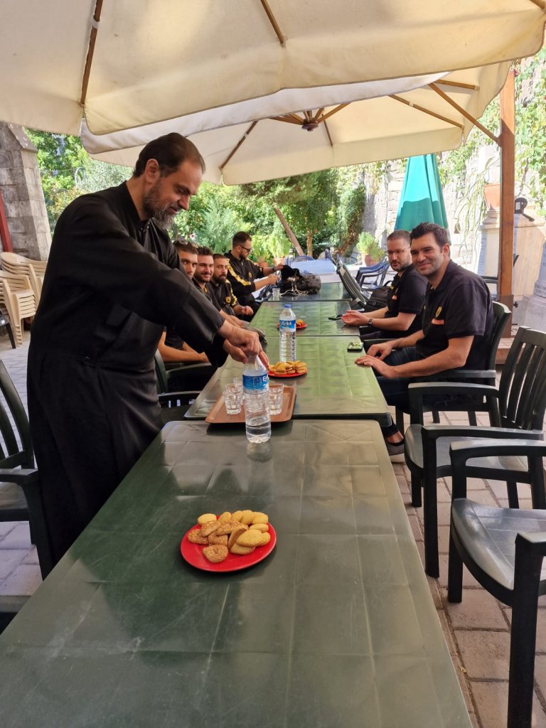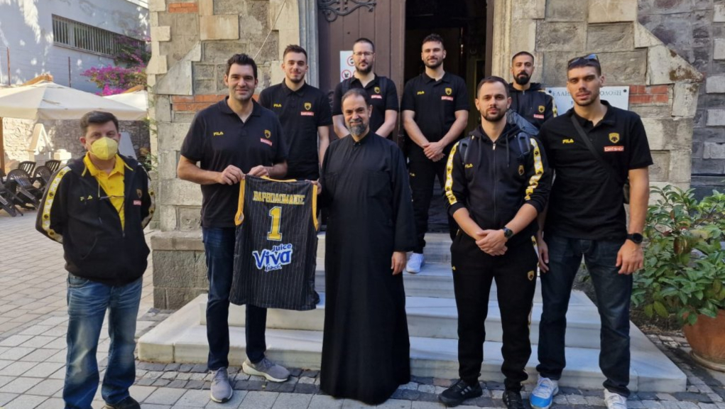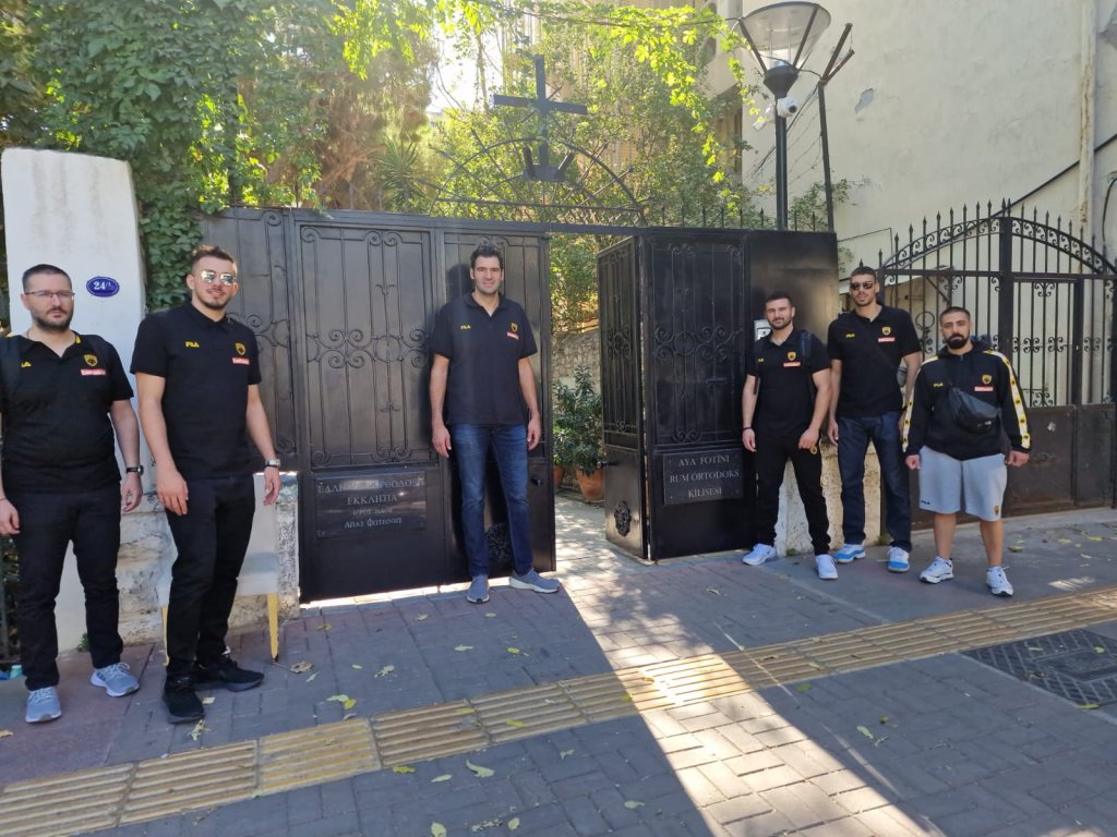 Οι «κιτρινόμαυροι» αθλητές/στελέχη λίγο πριν από την προπόνηση στο Κλειστό του χιλιοτραγουδισμένου Μπουρνόβα, προσκύνησαν με συγκίνηση και κατάνυξη στον Ιερό Ναό, και δέχτηκαν τον Θείο Λόγο και τη φιλοξενία του Πανασιολογιωτάτου Αρχιμανδρίτου, κ. Πολύκαρπου Θεοφάνη, Ιερατικώς Προϊσταμένου της Ορθοδόξου Κοινότητος Σμύρνης.