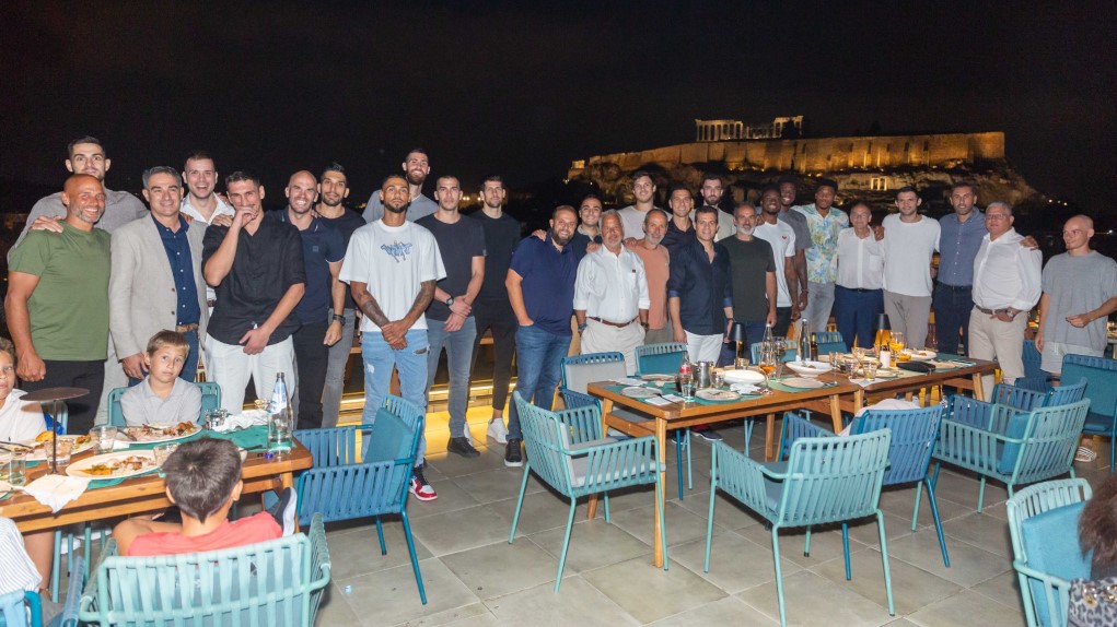 Η Εθνική Ομάδα δείπνησε με θέα την Ακρόπολη μια μέρα (23/8) προτού πετάξει για το Βελιγράδι, όπου την Πέμπτη (25/8) θα αναμετρηθεί με τη Σερβία για τα προκριματικά του Παγκοσμίου Κυπέλλου 2023. Παρούσες και οι οικογένειές τους.