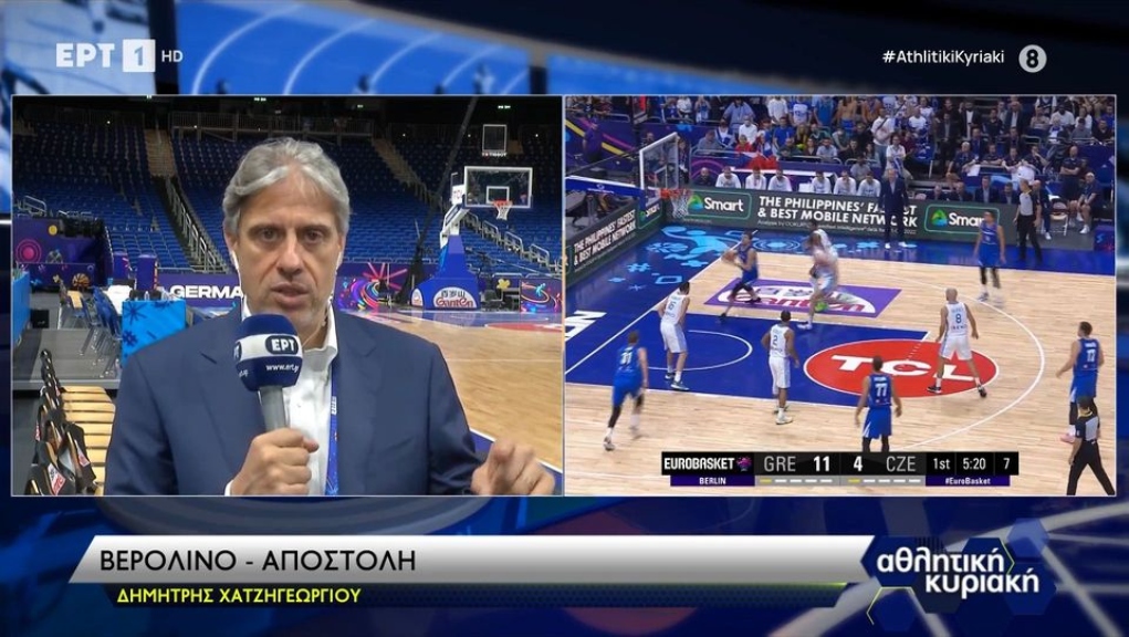 Ο απεσταλμένος της ΕΡΤ στο Βερολίνο, Δημήτρης Χατζηγεωργίου, κάνει τη σύνοψη του νικηφόρου αγώνα της Ελλάδας κόντρα στην Τσεχία και την πρόκριση της “Γαλανόλευκης” στους “8” του Ευρωμπάσκετ 2022.