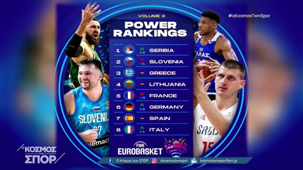 Πίσω από Σερβία και Σλοβενία δεσπόζει η παρουσία της Ελλάδας στην κατάταξη δυναμικότητας που ανήρτησε η FIBA στα social media της μία ημέρα πριν από το τζάμπολ της διοργάνωσης.