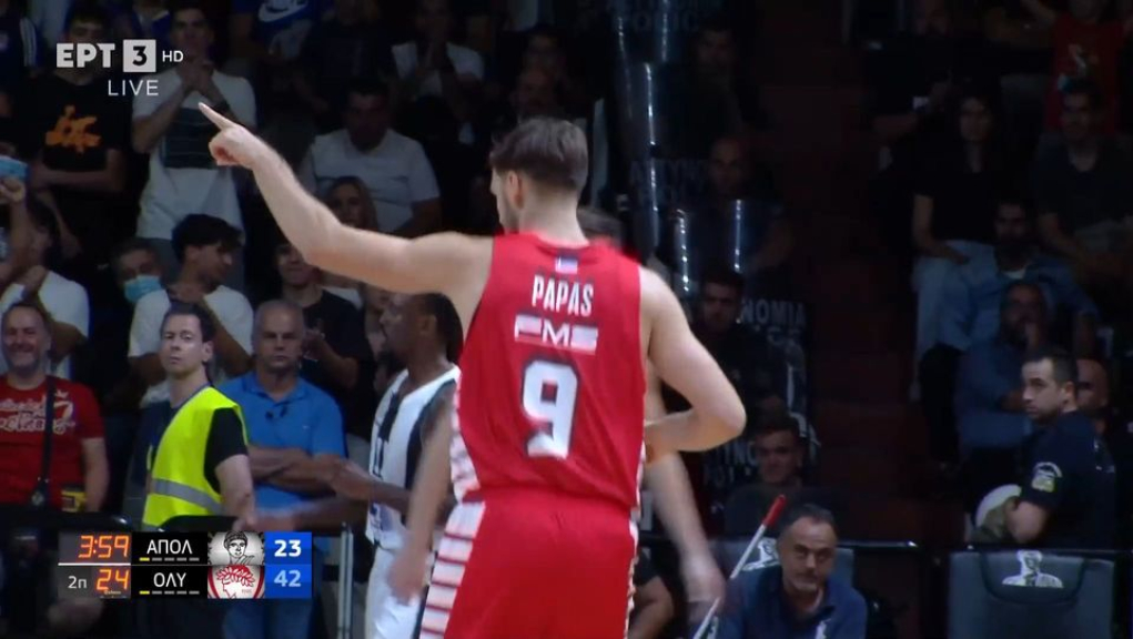 Ο Απόλλων υποδέχεται τον Ολυμπιακό στην Πάτρα, στο παιχνίδι με το οποίο ολοκληρώνεται η 1η αγωνιστική της Basket League και ο Τζορτζ Πάπας πέτυχε έξι συνεχόμενους πόντους για τους Πειραιώτες στα μέσα της β’ περιόδου.