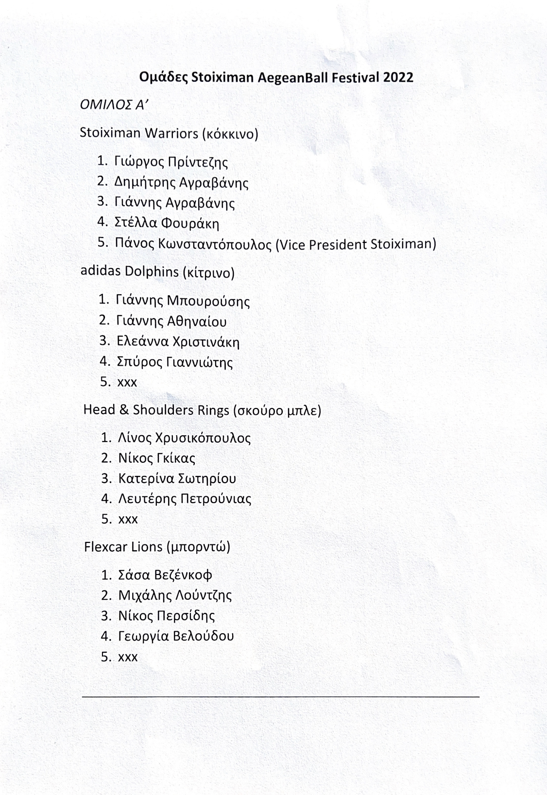 Οι Γιώργος Πρίντεζης, Δημήτρης Αγραβάνης, Σπύρος Γιαννιώτης, Γιάννης Μπουρούσης, Λευτέρης Πετρούνιας, Σάσα Βεζένκοφ, Δημήτρης Διαμαντίδης, Κατερίνα Χαλκιά, Βασιλική Μιλλούση θα αγωνιστούν μεταξύ άλλων στο Aegean Ball Festival.