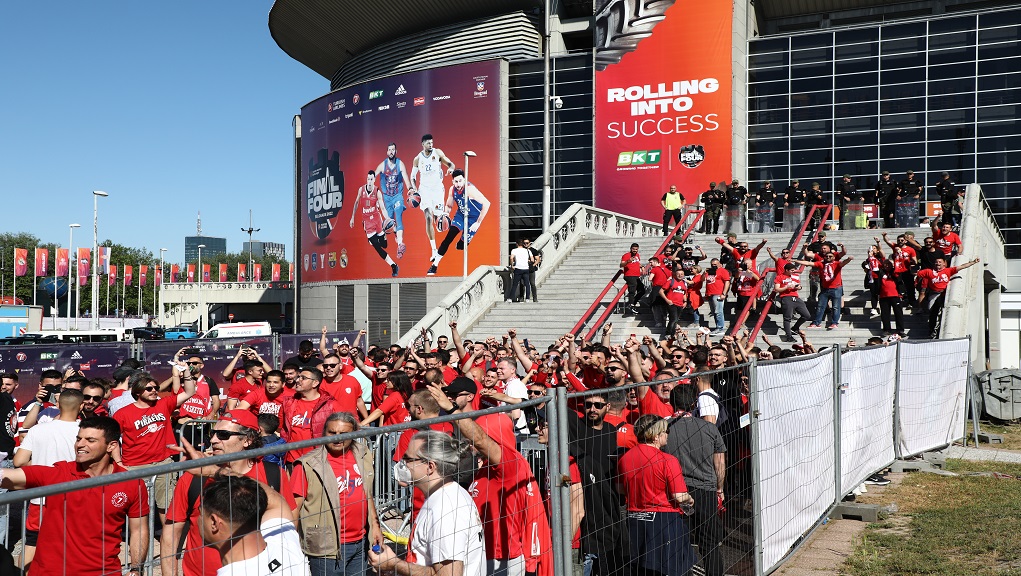 Μία ώρα και πενήντα λεπτά πριν από την έναρξη του ημιτελικού του Final-4 απέναντι στην Εφές έφτασε στο γήπεδο το λεωφορείο με τους παίκτες και τα στελέχη του Ολυμπιακού. Μόλις η αποστολή έγινε αντιληπτή από τους εκατοντάδες οπαδούς των Πειραιωτών, γνώρισε την αποθέωση με τον κόσμο να χειροκροτά και να φωνάζει συνθήματα.