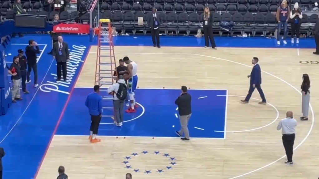 Ο Έλληνας σούπερ σταρ πήγε στα αποδυτήρια και επέστρεψε με δύο δικές του μπάλες. Τότε, οι εργάτες των Σίξερς πήγαν μία σκάλα στην μπασκέτα που εκτελούσε βολές, προκειμένου να αφαιρέσουν τις κάμερες και ο Γιάννης τους ζήτησε να τον κάνουν αργότερα. Οι ίδιοι αρνήθηκαν, προκαλώντας τον εκνευρισμό του, που τον οδήγησε να πετάξει τη σκάλα στο παρκέ.