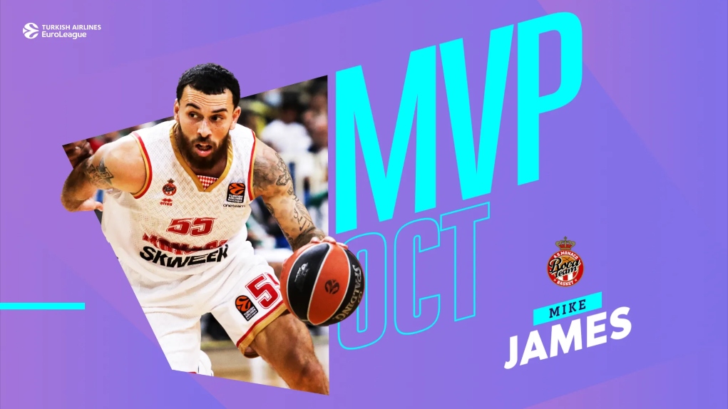 Ο Μάικ Τζέιμς πήρε το βραβείο του MVP της EuroLeague για τον Οκτώβριο, οδηγώντας την ομάδα του σε ένα σερί 4-1, φτάνοντας τα τέσσερα σχετικά βραβεία στη διοργάνωση.