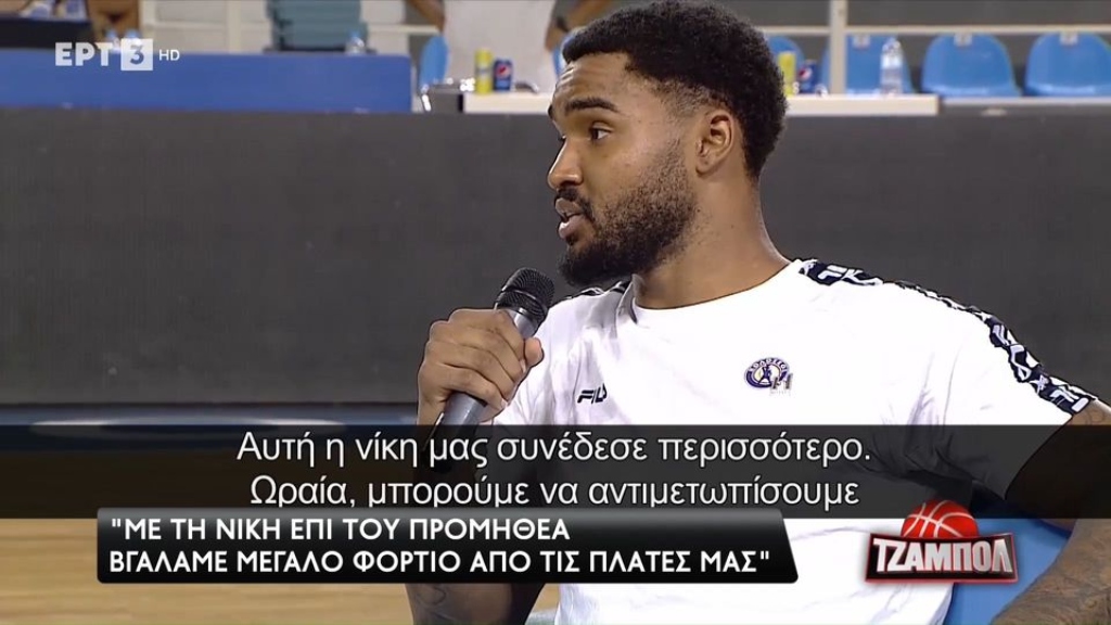 Ο 24χρονος Αμερικανός παραχώρησε δηλώσεις στην κάμερα της ΕΡΤ και τον Κώστα Χαλβατσιώτη και αναφέρθηκε μεταξύ άλλων στην πρώτη νίκη του Κολοσσού Ρόδου στην Basket League, ενώ μίλησε και για τον “Greek Freak”.