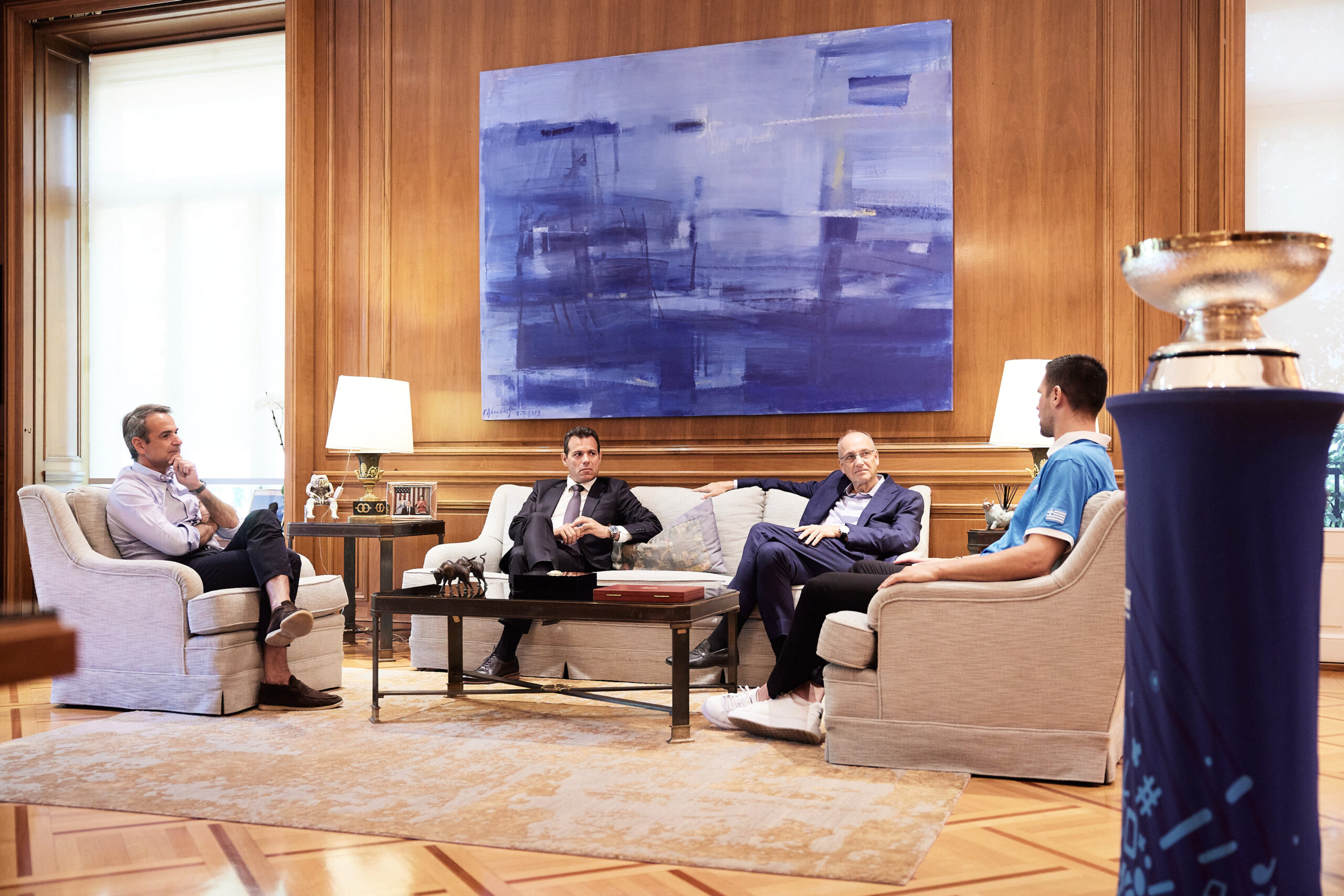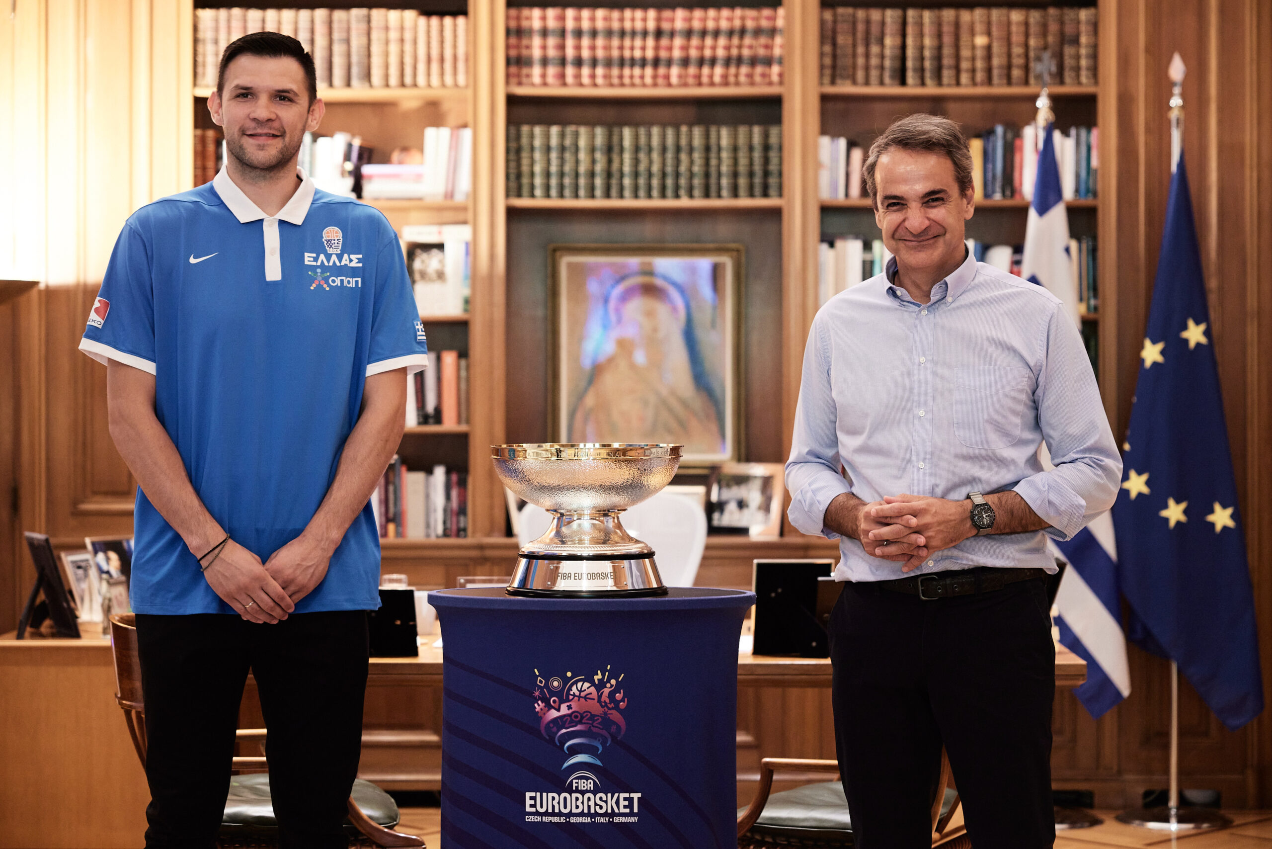 Ο κ. Κυριάκος Μητσοτάκης, συναντήθηκε το πρωί της Τρίτης (26/7) στο Μέγαρο Μαξίμου με τον Πρόεδρο της ΕΟΚ, Βαγγέλη Λιόλιο, τον νέο ομοσπονδιακό προπονητή, Δημήτρη Ιτούδη και τον διεθνή, Κώστα Παπανικολάου, οι οποίοι του παρουσίασαν το επίσημο τρόπαιο του Ευρωμπάσκετ 2022, στο πλαίσιο της περιοδείας του κυπέλλου στις χώρες που συμμετέχουν στη διοργάνωση.