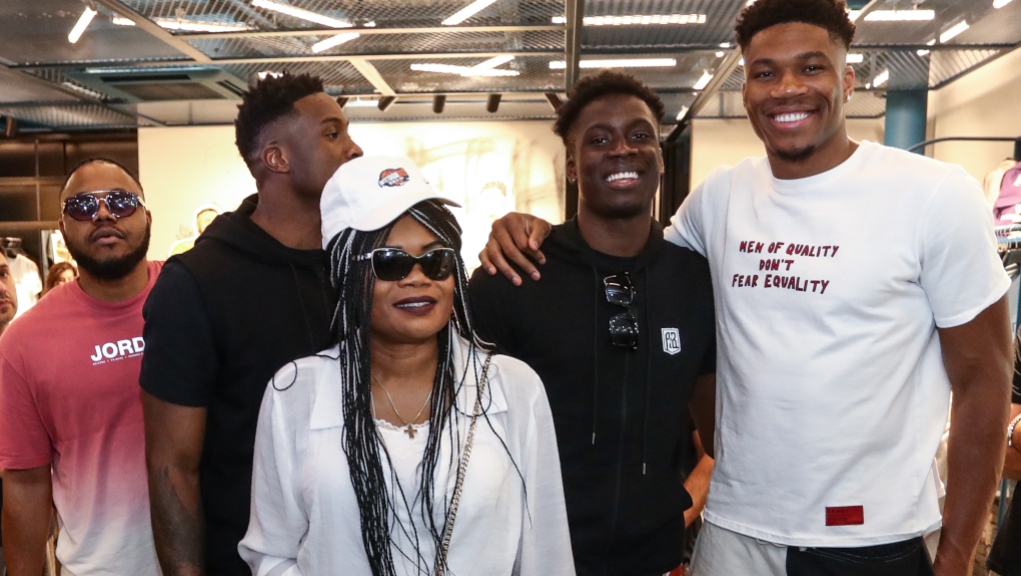 Τα αδέλφια Αντετοκούνμπο, ο Γιάννης, ο Θανάσης και ο Άλεξ βρέθηκαν σήμερα (17/06) το μεσημέρι στο αεροδρόμιο του “Ελ. Βενιζέλος” και εγκαινίασαν το νέο κατάστημά τους, το οποίο περιλαμβάνει αυθεντικά ρούχα και αξεσουάρ αθλητικού περιεχομένου. Μαζί τους βρέθηκε μάλιστα και ο μεγαλύτερος αδερφός, Φράνσις, αλλά και η μητέρα τους, Βερόνικα, όχι όμως και ο Κώστας, καθώς αγωνίζεται κόντρα στη Μονακό στο πλαίσιο της δεύτερης αναμέτρησης για τους τελικούς του γαλλικού πρωταθλήματος.