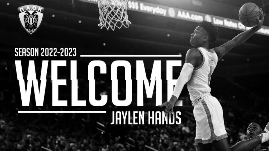«Η ΚΑΕ ΠΑΟΚ mateco ανακοινώνει τη συμφωνία με τον Αμερικανό καλαθοσφαιριστή Jaylen Hands για την αγωνιστική περίοδο 2022-2023. Ένας νέος και φιλόδοξος αθλητής, με πολύ ταλέντο και εντυπωσιακές αθλητικές ικανότητες, είναι ο πρώτος ξένος παίκτης της ομάδας μας για την επόμενη αγωνιστική περίοδο.