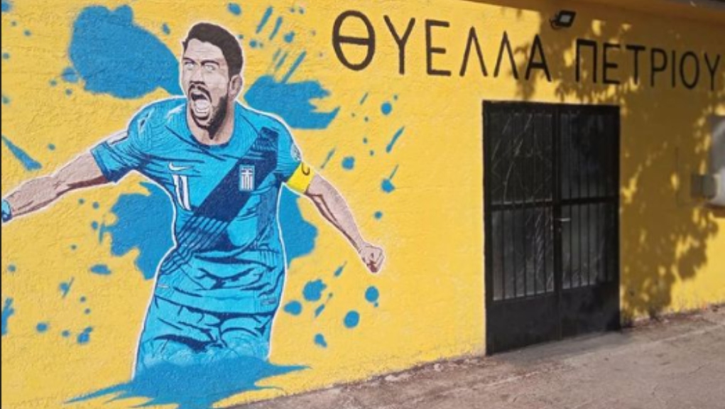 Η τοπική ομάδα, Θύελλα Πετρίου, για να τιμήσει το “δικό” της παιδί και αρχηγό της Εθνικής Ελλάδας, δημιούργησε ένα υπέροχο γκράφιτι, όπου τον απεικονίζει να πανηγυρίζει με τη “γαλανόλευκη” φανέλα.