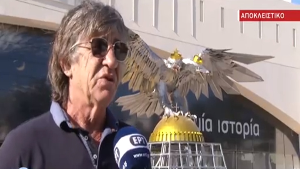 Η ιστορία συνάντησε το μέλλον. Ο Θωμάς Μαύρος μίλησε στην κάμερα της ΕΡΤ και τον Μίλτο Θεοδοσίου μπροστά από τον επιβλητικό ατσάλινο “Δικέφαλο Αετό” και δεν έκρυψε τον θαυμασμό του για το γλυπτό της “Αγια-Σοφιάς”.