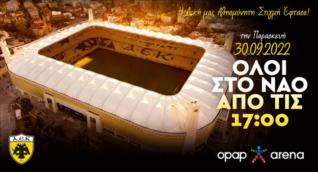 Η στιγμή που περίμενε όλη η οικογένεια της ΑΕΚ για σχεδόν δύο δεκαετίες έφτασε! Η ομάδα μας επιστρέφει αύριο (30/9 – 20.00) στη φυσική της έδρα, τη Νέα Φιλαδέλφεια για να εγκαινιάσει το νέο της σπίτι, την OPAP ARENA.