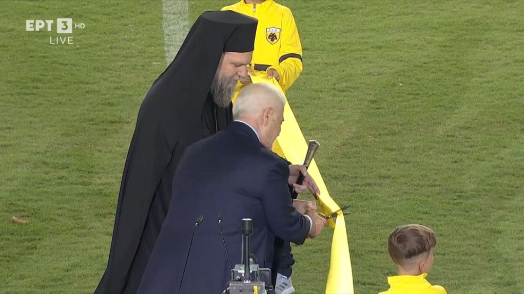 Μετά το τέλος της ομιλίας του ο διοικητικός ηγέτης της ΑΕΚ, κάλεσε τον Μητροπολίτη Νέας Φιλαδέλφειας-Χαλκηδόνας, Γαβριήλ, να κόψουν μαζί την κορδέλα του γηπέδου.