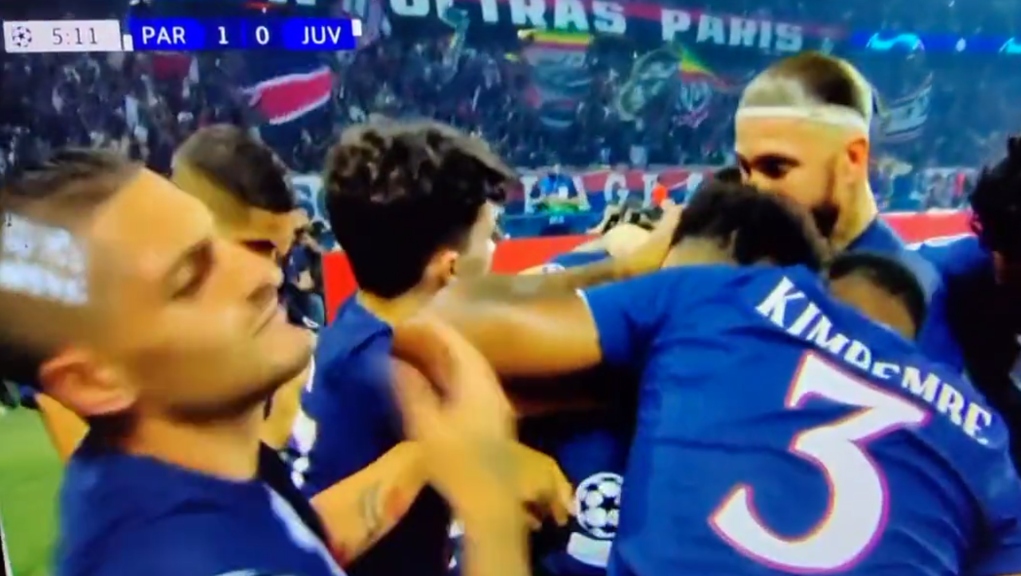 Ο Ιταλός μέσος θέλησε να αγκαλιάσει κι αυτός τον σκόρερ του πρώτου τέρματος για τους Παριζιάνους, ωστόσο ο Πρεσνέλ Κιμπεμπέ τον απώθησε άθελά του με αγκωνιά.