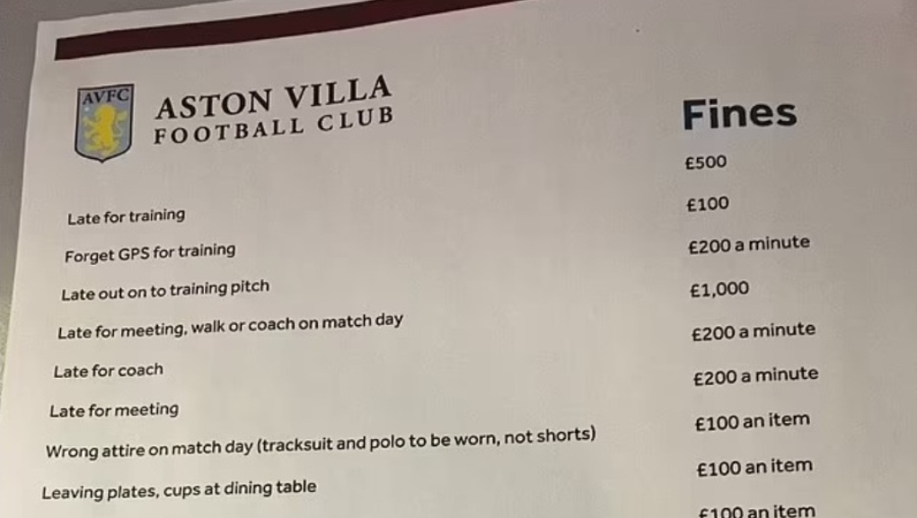 Πολύ ακριβά θα πληρώνουν οι παίκτες της Άστον Βίλα τη μη συμμόρφωσή τους με τον εσωτερικό κανονισμό που θέσπισε ο Στίβεν Τζέραρντ. Συγκεκριμένα, μία φωτογραφία που βγήκε στο φως της δημοσιότητας με τον… τιμοκατάλογο των παραβάσεων, αποδεικνύει πως ο τεχνικός των “χωριατών” επιθυμεί την πλήρη πειθαρχία των παικτών του.