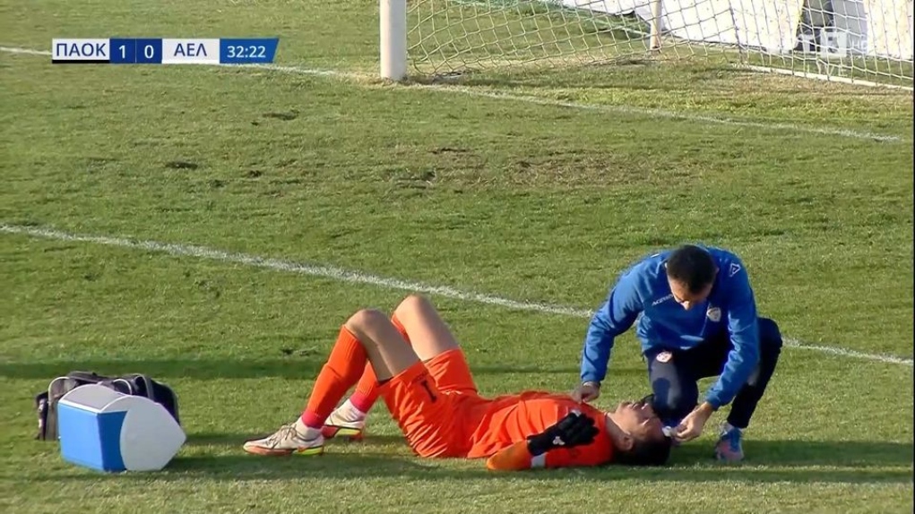 Ο τερματοφύλακας της ΑΕΛ τραυματίστηκε στη φάση του γκολ με αποτέλεσμα να γίνει αναγκαστική αλλαγή πριν την ολοκλήρωση του πρώτου μέρους.