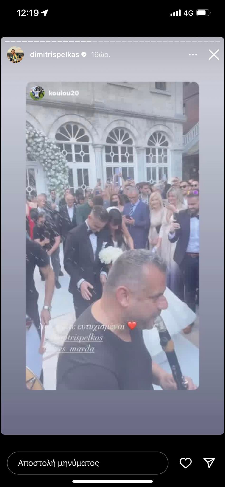 Μετά το μυστήριο, η συνέχεια δόθηκε στο γλέντι, με τα τραγούδια του Πέτρου Ιακωβίδη που ξεσήκωσαν τους καλεσμένους, όπως φαίνεται και στο βίντεο που ανήρτησε στον προσωπικό του λογαριασμό ο ίδιος ο Δημήτρης Πέλκας.