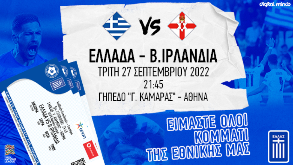 «Αρχίζει από σήμερα η διάθεση των εισιτηρίων για τον εντός έδρας αγώνα της Εθνικής Ομάδας με τη Β. Ιρλανδία, τελευταίο της Εθνικής μας Ομάδας στον 2ο όμιλο της League C του UEFA Nations League 2022-23 («Γεώργιος Καμάρας», 27/09/2022, 21:45).