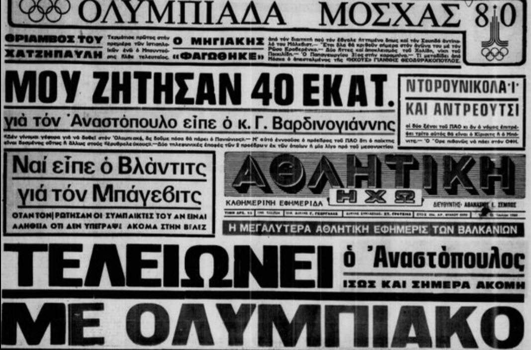 Η μεταγραφή του Νίκου Αναστόπουλου από τον Πανιώνιο στον Ολυμπιακό, αποτέλεσε το 1980 το μεγαλύτερο ποδοσφαιρικό σίριαλ.