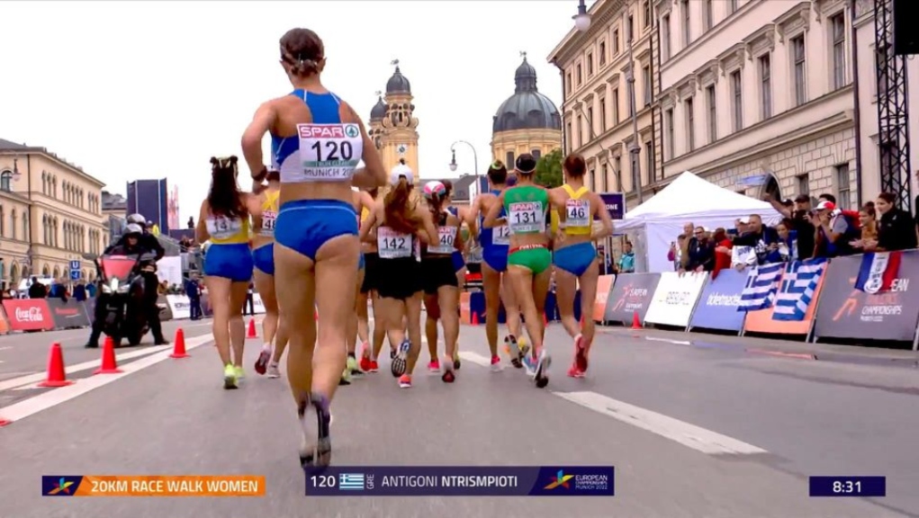 Η Αντιγόνη Ντρισμπιώτη και η Χριστίνα Παπαδοπούλου αγωνίζονται στα 20χλμ βάδην του Ευρωπαϊκού Πρωταθλήματος στίβου στο Μόναχο και κατά τη διάρκεια του αγώνα τους είδαν στο πλευρό τους ελληνικές σημαίες για τη στήριξη προς το πρόσωπό τους.