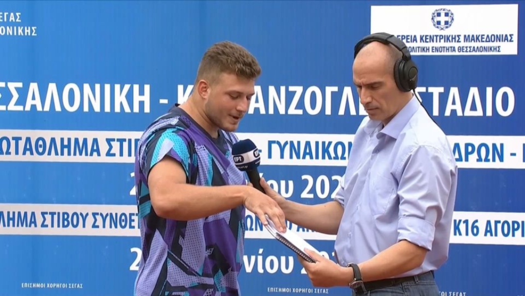 Ο 22χρονος αθλητής, μετά την πρωτιά του στον τελικό της σφυροβολίας στο Πανελλήνιο Πρωτάθλημα Ανδρών/Γυναικών, μίλησε στην κάμερα της ΕΡΤ και εξέφρασε τις φιλοδοξίες του σχετικά με τις επιδόσεις του.