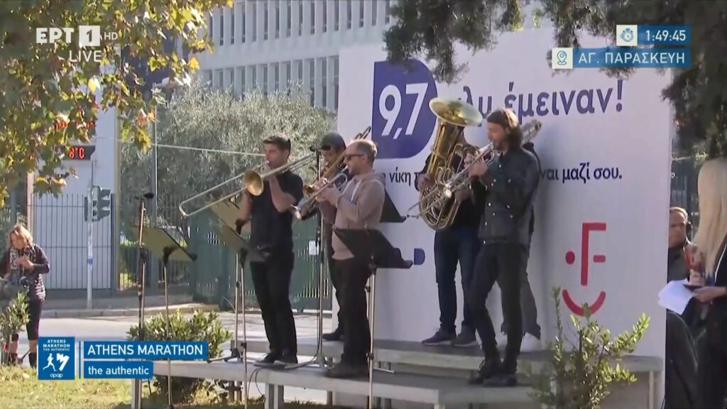 Έξω από την είσοδο του κτηρίου της ΕΡΤ βρίσκεται μια μπάντα η οποία υποδέχεται τους μαραθωνοδρόμους, 9.7 χιλιόμετρα πριν τον τερματισμό στο Παναθηναϊκό Στάδιο.//