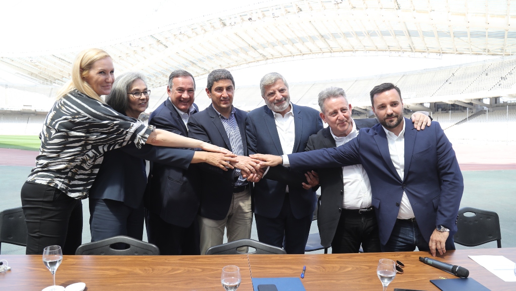 Στις εγκαταστάσεις του Ολυμπιακού Σταδίου, Λευτέρης Αυγενάκης και Γιώργος Πατούλης, υπέγραψαν τη Προγραμματική Σύμβαση αντικατάστασης του συνόλου των ελαστικών συνθετικών ταπήτων -ταρτάν- σε όλα τα στάδια.